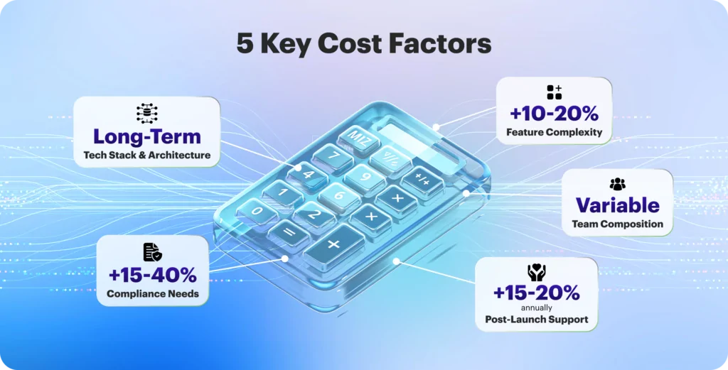 About 60-70% of the total budget is allocated to development directly. Still, the ultimate software development cost 2026 is not a straightforward reflection of the team’s hours worked. It varies with the product, the people, and the process. The main factors that determine the custom software cost are as follows.