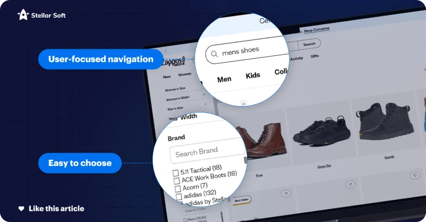 Zappos has a highly user-focused navigation system with well-organized categories and powerful filters, allowing customers to narrow down options by brand, size, and style effortlessly.