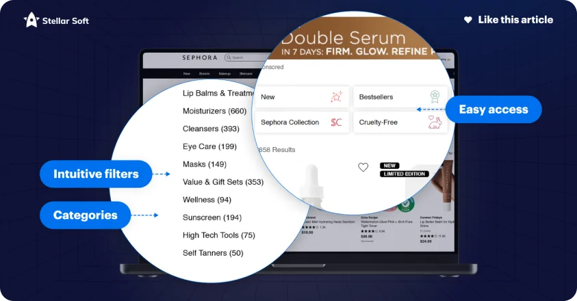 Sephora’s navigation is built around intuitive categories and filters that cater to beauty enthusiasts, offering easy access to products by brand, ingredient, and even customer reviews. The “Find Your Match” tool further enhances the user experience.